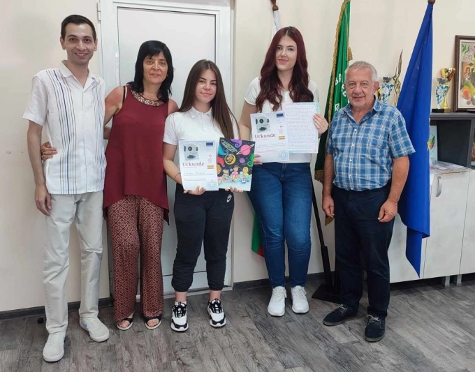 Двете момичета с преподавателите по немски език Радослава Стоянова и Борислав Маринов (вляво) и директора на СУ "Васил Левски" Тома Томев, снимка: СУ "В. Левски"