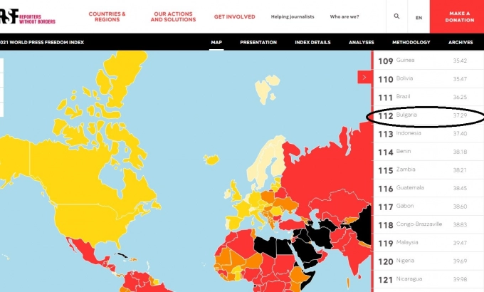 България изпадна с една позиция надолу и вече е на 112 място от 180 държави по свобода на медиите, става ясно от публикувания годишен индекс за свобода на печата. Страната ни е на последно място в Европейския съюз, а на Балканите с по-лоша медийна среда е само Турция, която е на 153 място, информират от българската секция на Асоциацията на европейските журналисти.