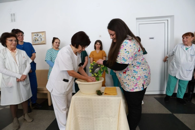 Днес по традиция в отделението по акушерство и гинекология посрещат гости. Екипът на отделението воден от д-р Петко Дончев посрещна общинското ръководство начело с кмета Иван Иванов, представители на бизнеса и благодарни пациентки. Изпълнен беше традиционният ритуал измиване на ръце, при който най-възрастната акушерка е обгрижена от най-младата.