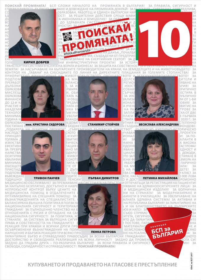 Коалиция „БСП за България“ е с номер 10 в интегралната бюлетина