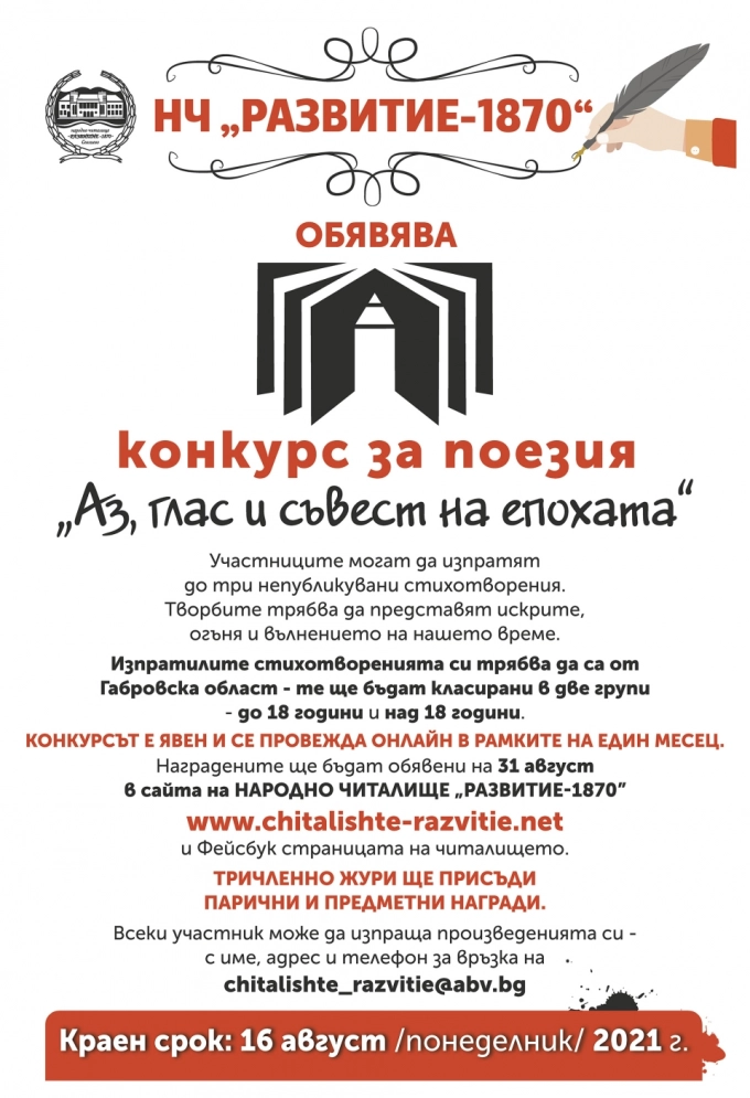 Народно читалище "Развитие-1870" в Севлиево обявява поетичен конкурс под наслов "Аз, глас и съвест на епохата".