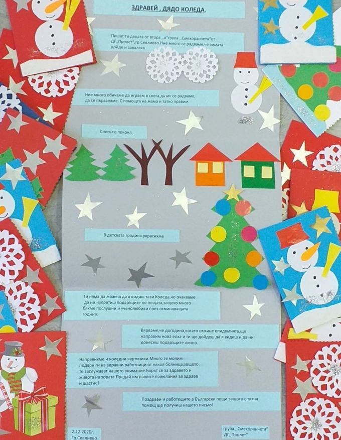 Картичките са изработени от децата от група „Смехоранчо“ в детска градина „Пролет“ в Севлиево. След като ги направили, децата изпратили писмо до Дядо Коледа, с което молят добрият старец да занесе изработените от тях картички на здравните работници в местната болница. От „Български пощи“ откликнали с готовност и се заели молбата на децата да стигне до Дядо Коледа, а след това, отново с тяхна помощ, картичките да бъдат предадени на лекари, сестри и санитари в МБАЛ "Д-р Стойчо Христов".