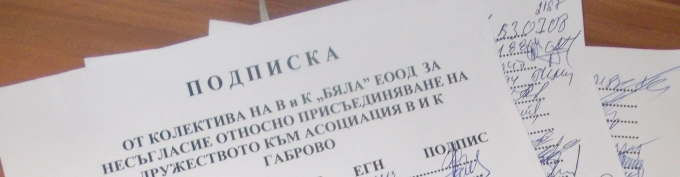 Работниците и служителите на ВиК "Бяла" ЕООД изразяват своето несъгласие с присъединяването на дружеството към Асоциацията по ВиК Габрово с подписка, която тези дни ще бъде връчена на кмета на Севлиево и председателя на Общинския съвет. "Независимо от решението на общинските съветници относно присъединяването, ние смятаме, че жителите на общината трябва да знаят нашата позиция, както и че в дружеството ни не работят мъртви души", пишат към подписката близо стотината служители на "Бяла" ЕООД.
