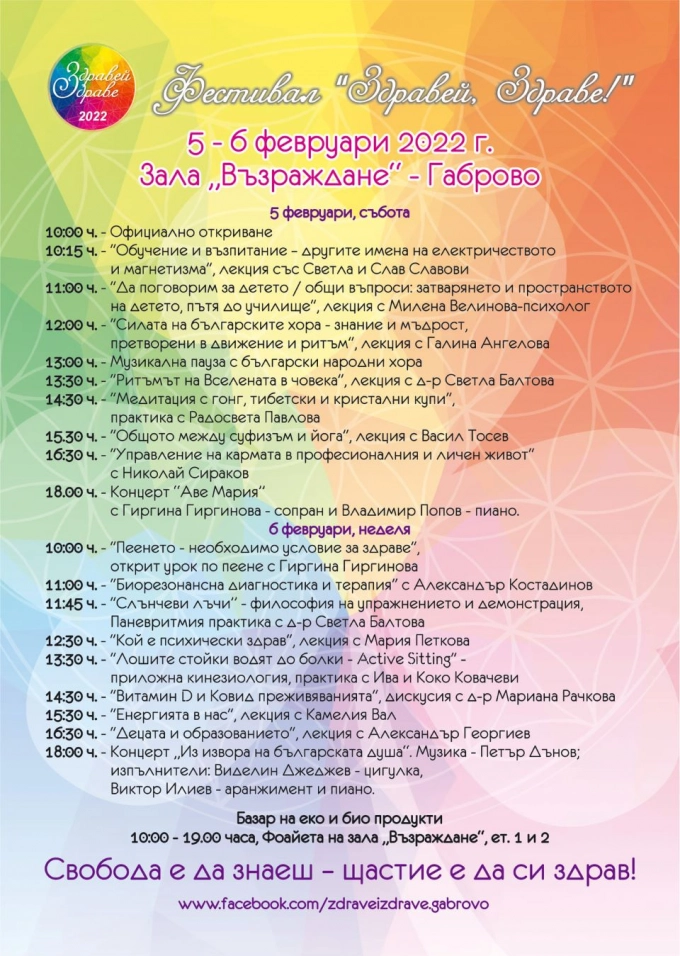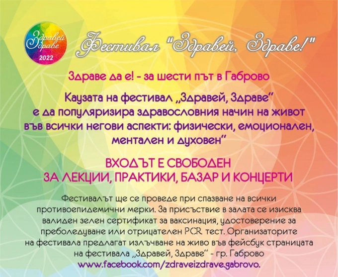 И тази година ще се проведе фестивалът "Здравей, здраве", който има за цел да популяризира здравословния начин на живот във всички негови аспекти. Лекциите, практиките и демонстрациите ще се проведат на 5 и 6 февруари в зала "Възраждане", Габрово и ще дадат трибуна на лектори и специалисти, споделящи практики, свързани с физическото, менталното и емоционалното здраве на човека. Във фоайето на зала "Възраждане" ще се намира и техника за здравна диагностика.