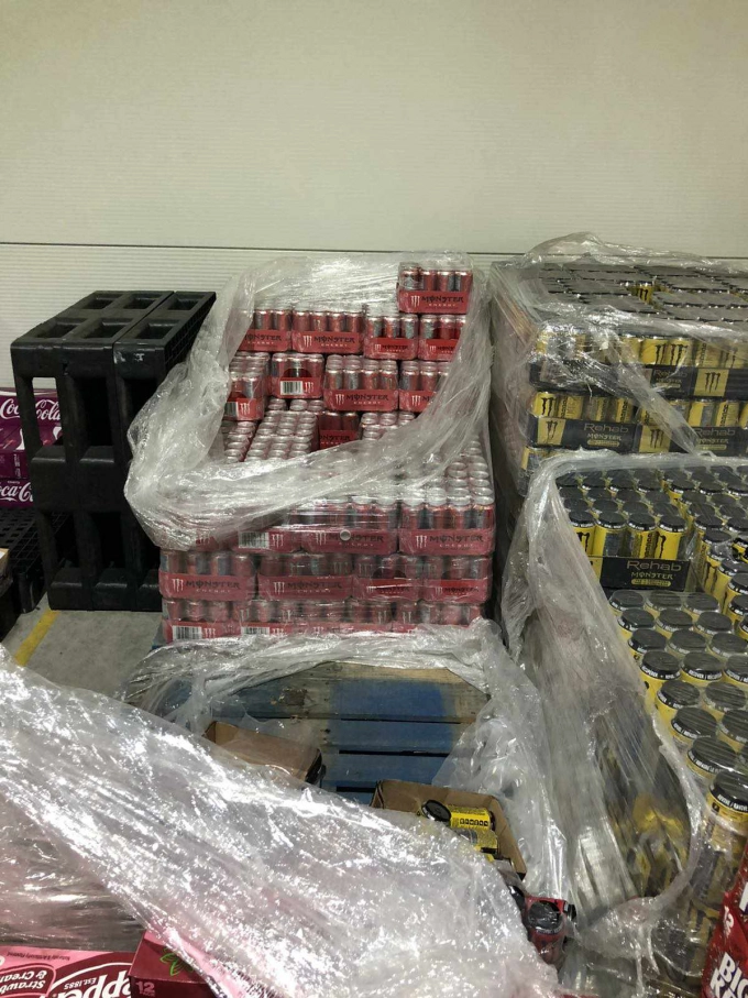При проверката са установени складирани и подготвени за последваща експедиция пакетирани хранителни стоки и напитки от различни марки, всичките в големи количества.