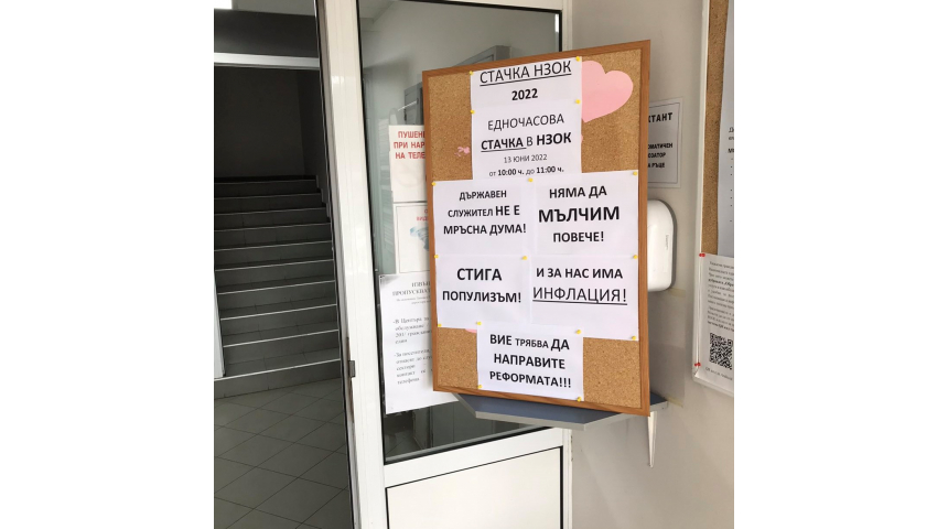 Офисът на РЗОК днес посрещаше посетители с надписи "държавен служител не е мръсна дума", "няма да мълчим повече", "стига популизъм" и "вие трябва да направите реформата". Ако исканията на протестиращите не бъдат чути, те заплашват, че ще спрат плащанията към болници, аптеки и медицински заведения.