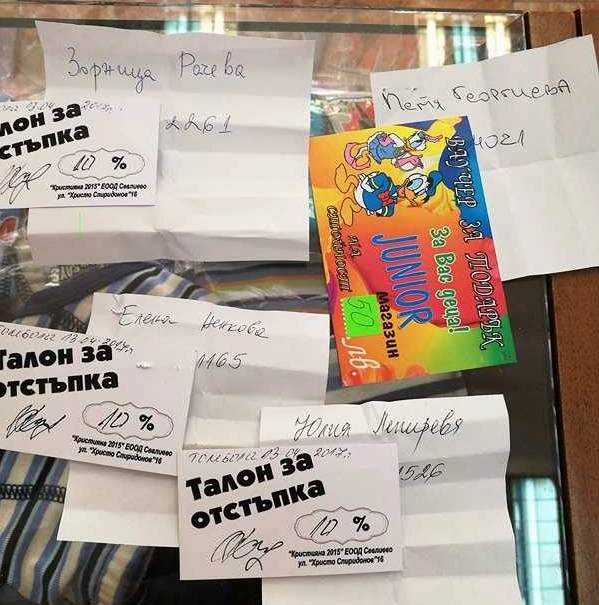 Собственичката на магазина Мария Борисова изтегли имената на останалите три печеливши, които печелят талон за отстъпка от 10% за всяка закупена от магазина стока за една година напред. Техните имена са Елена Ненкова, Юлия Липирова и Зорница Рачева. От магазин "Джуниър" ще се свържат със спечелилите още днес, за да им връчат наградите.