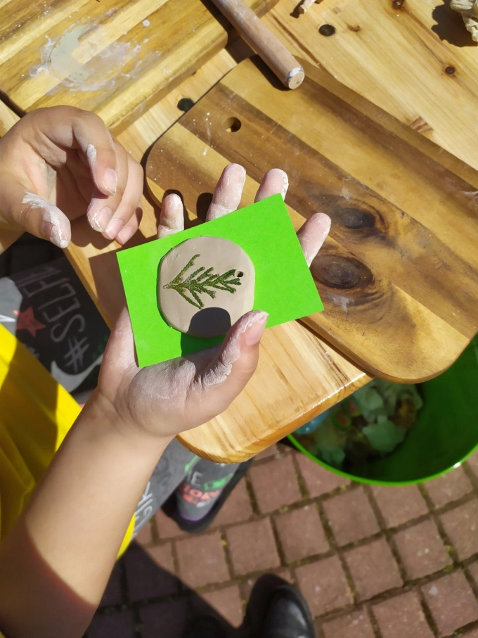 Малчуганите сами си изработиха глинени медальони, които украсиха с отпечатък от листа на дива ягода, папрат, кипарис, миризлив здравец, вратига, сребрист очиболец, бял равнец, леска, габър и други.