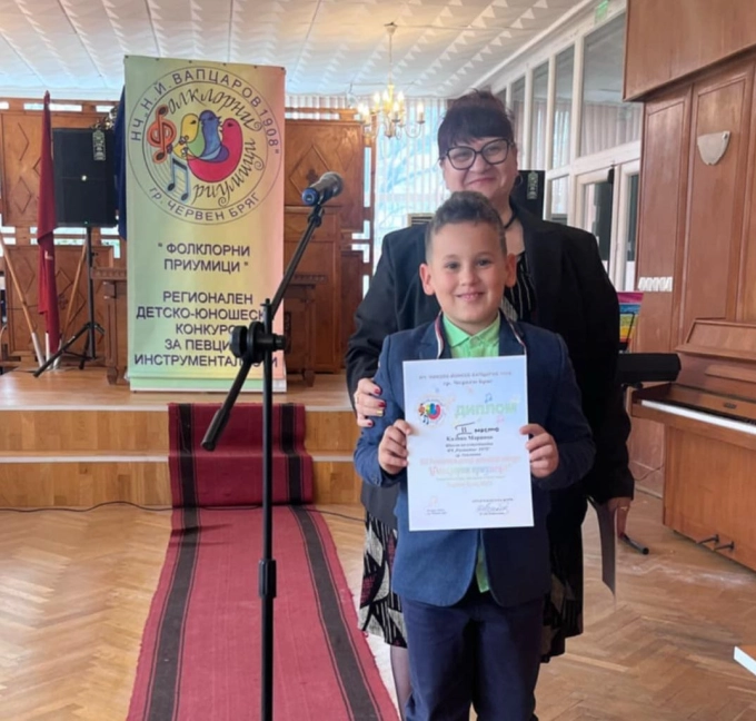 Медал и второ място завоюва пианистът Калоян Маринов от Школа по пиано и солфеж при Народно читалище „Развитие-1870” в деветнайстото издание на детско-юношеския конкурс „Фолклорни приумици”.
