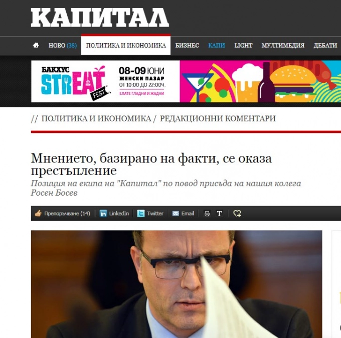 На 21 май Софийският градски съд осъди окончателно журналиста от "Капитал" Росен Босев по наказателно дело, заведено от бившия председател на Комисията по финансов надзор (КФН) Стоян Мавродиев. Решението на съда предизвика остра реакция от колегите на Росен Босев, които днес разпространиха позиция на екипа на "Капитал". "Севлиево онлайн" публикува пълния текст на позицията и подписката под нея.