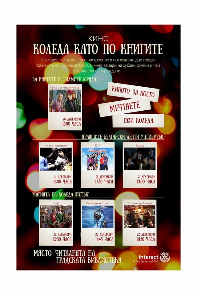 По случай коледните празници от Интеракт Клуб Севлиево организират кино в библиотеката. Събитието ще се състои в три последователни дни, като всеки от тях има тематика: