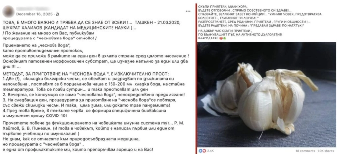 През декември миналата година във Фейсбук се появява публикация, която разпространява твърдението, че приемането на „чеснова вода“ през зимата действа като „биоваксина“ и формира имунитет срещу COVID-19. Според публикацията чесновата вода се приготвя като се добавят две скилидки български чесън в порцеланова чаша с вода. Според създателя на публикацията, отварата се пие като „противоепидемичен протокол“ и се приема цяла зима. Постът има над 2400 харесвания и над 1900 споделяния.
