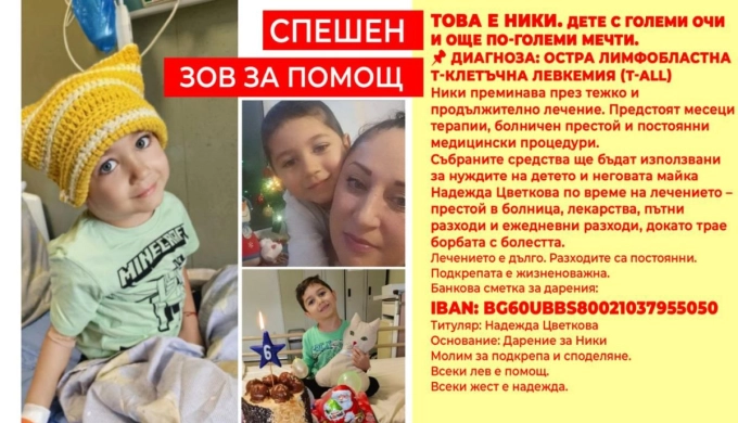 Шестгодишният Николай Маринов от Габрово, борещ се с коварно заболяване, има нужда от подкрепа. Той е диагностициран с остра лимфобластна Т-клетъчна левкемия (T-ALL), която засяга кръвта и костния мозък. В момента провежда втори етап на лечение в Клиниката по детска хематология и онкология на УМБАЛ „Царица Йоанна – ИСУЛ“ в София.
