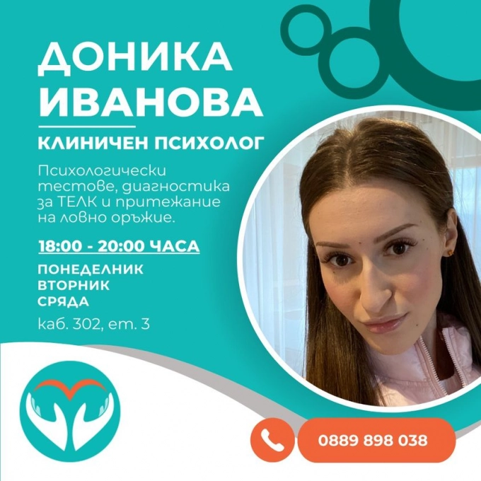 Доника Иванова извършва психологически тестове и диагностика за ТЕЛК, психологически тестове за притежание на ловно оръжие.