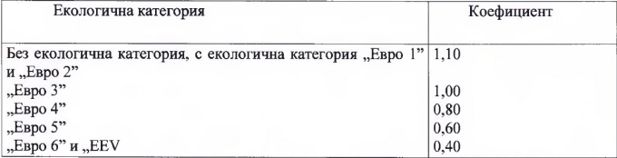за екологична категория Евро 3 – от 1.00 до 1.10, за Севлиево – 1.00. Категория Евро 4 – от 0.80 – 1.00 – за Севлиево отново най-ниския размер – 0.80, за Евро 5 – от 0.60 до 0.80 – тук отново е приета най-ниската ставка, същото важи и за Евро 6 и ЕЕV, където границите на коефициента са от 0.40 до 0.60.
