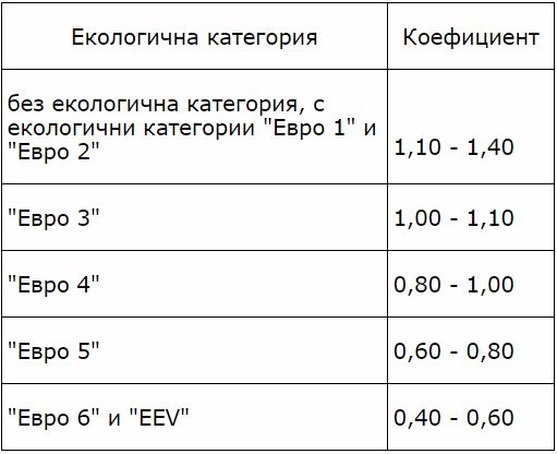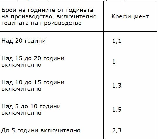 За автомобили над 20 г. коефициентът е 1.1, за коли над 15 г. до 20 г. включително – 1, коли на от 10 до 15 г. включително – 1.3, над 5 до 10 г. - 1.5 и до 5 г. включително – 2.13.