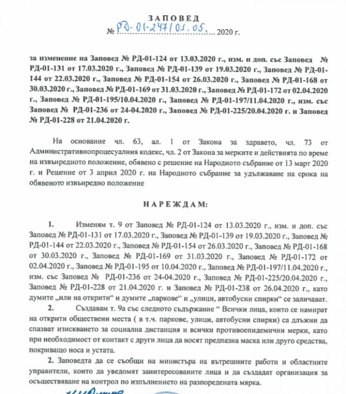 Днес следобед от Министерството на здровеопазването разпространиха заповед на министър Кирил Ананиев, която изменя няколко предишни негови заповеди. С днешната отпада задължителното носене на предпазни маски за лице на открито, освен в случаите, когато контактуваме с някого. Тогава сме длъжни, според заповедта, да прикриваме устата и носа си с маска или друго средство (не се уточнява какво).