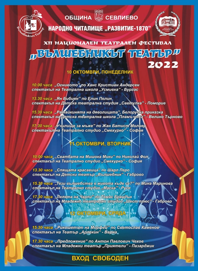 Това е Дванайстото издание на Националния фестивал "Вълшебникът театър". Всички постановки са със свободен вход, малки и големи са добре дошли, казаха от Читалището.