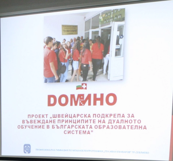 В Севлиево 51 ученици от Професионалната гимназия по механоелектротехника „Ген. Иван Бъчваров” от две професии - машинен техник (специалност „Машини и системи с цифрово-програмно управление“) и електротехник (специалност „Електрообзавеждане на производството”) учат по швейцарската система „учене чрез работа“. Техни партньори в рамките на проекта ДОМИНО на Българо-швейцарската програма за сътрудничество са фирмите "Идеал Стандарт-Видима", АББ България, клон Севлиево и ЕМКА.