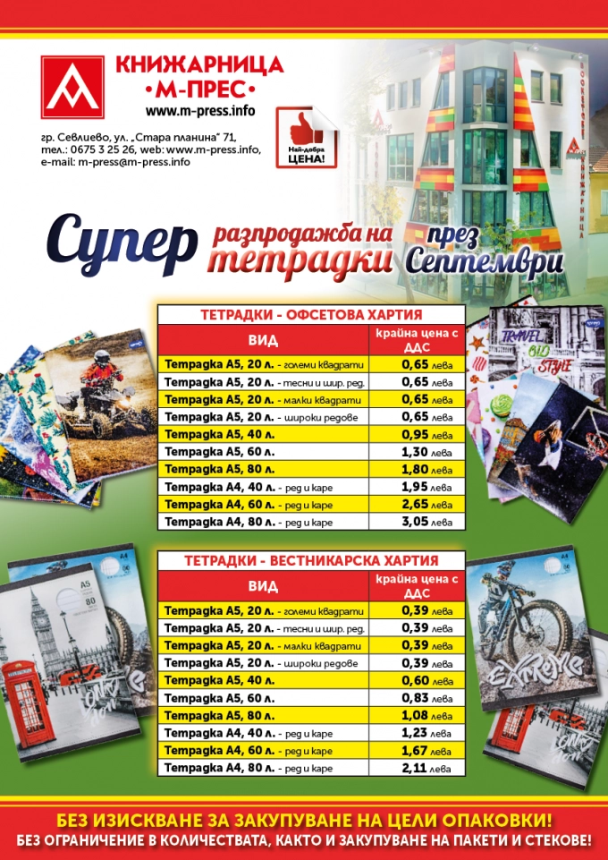 От днес до края на септември, в книжарницата обявяват супер разпродажба на тетрадки. Няма изискване за купуване на цели опаковки. Няма и ограничение в закупените минимални количества.
