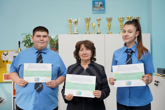С този проект учениците Вероника Петрова и Преслав Пройнов от 9-а клас и техният учител Красимира Томева участваха в XXII Национално състезание по природни науки и екология, което се проведе в Разград от 15 до 17 ноември. В оспорвана надпревара ученици от цялата страна защитаваха своите проекти, свързани с актуални за обществото проблеми. Състезанието протича в две възрастови групи, а разработките се представят на постерна сесия и на публична защита. Оценяват се от преподаватели в университети.