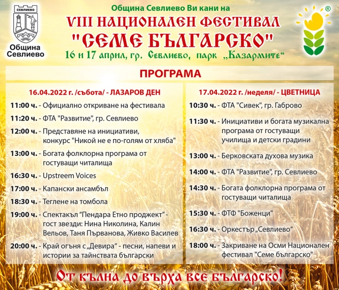 Организаторите обещават не само да е много цветно, но и усмихващо, смислено и вдъхновяващо събитие през двата фестивални дни, където всеки посетител ще бъде не просто зрител, но и участник на идеята от кълна до върха все да е българско в името на нашите корени и памет.