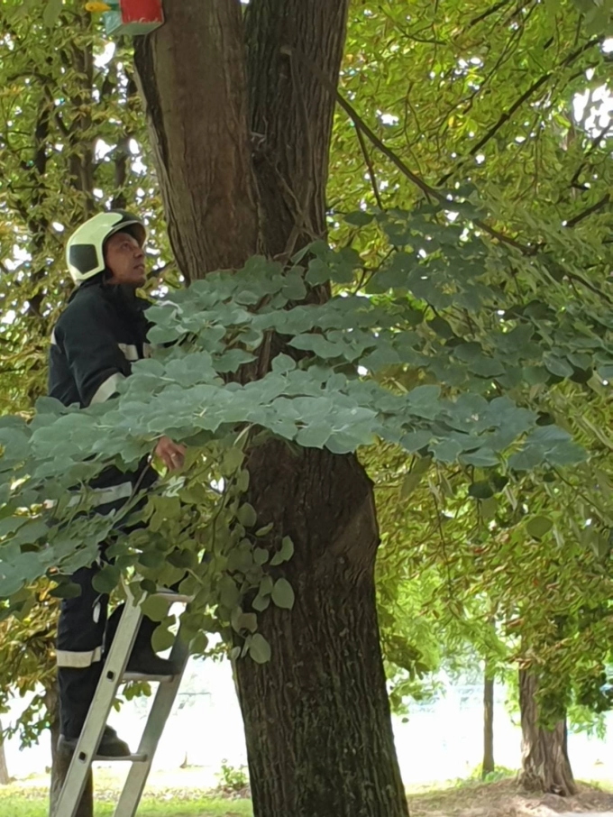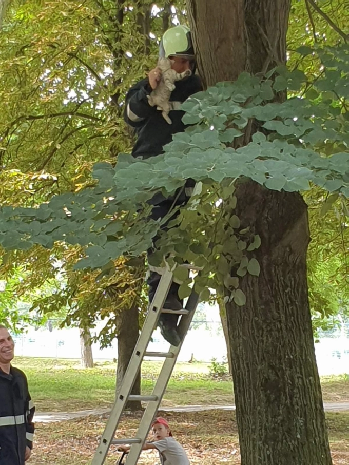 В неделя служители на Районната служба за пожарна безопасност в Севлиево се отзоваха на сигнал за бедстващо коте. Малкото животинче се покатерило до върха на дърво, но не успявало да слезе оттам.