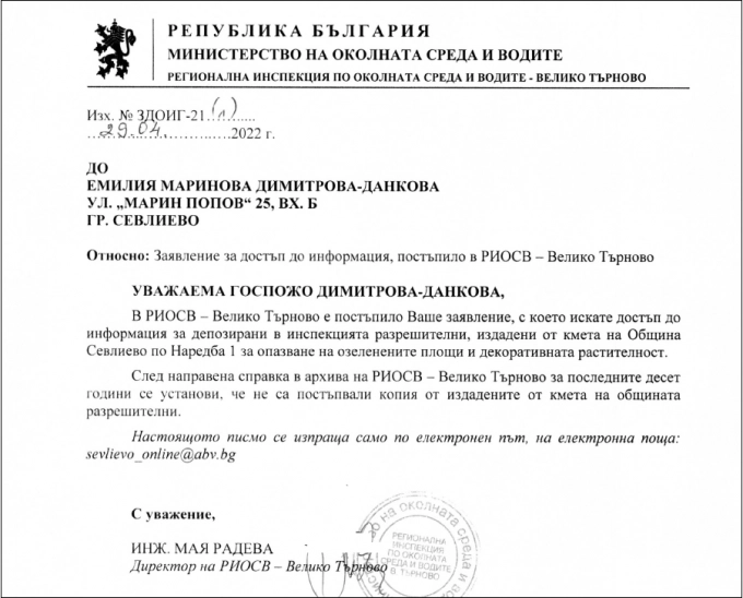 Отговорът на РИОСВ В. Търново, от който става ясно, че Община Севлиево не е депозира копия от разрешителните за отсичане на дървета в инспекцията, снимка: "Севлиево онлайн"