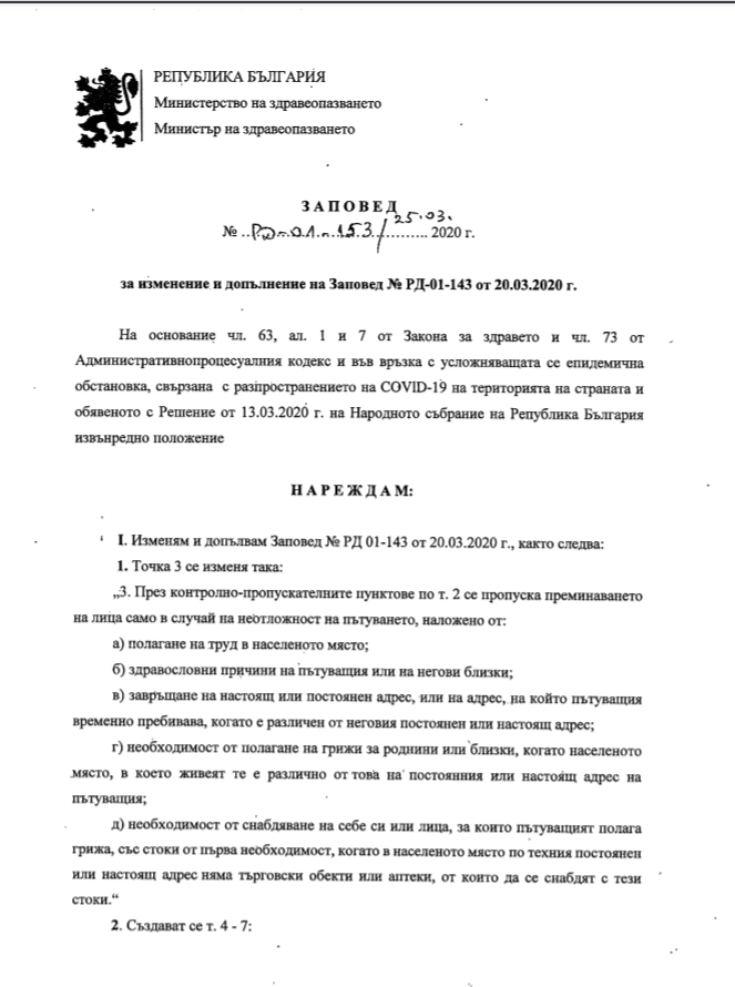 Министърът на здравеопазването издаде заповед, с която се облекчава преминаването през контролно-пропускателните пунктове на входно-изходните пътища на областните центрове.
