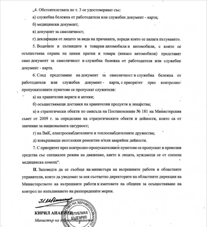 През контролно-пропускателните пунктове ще се пропускат с предимство служители на хранителни вериги и аптеки, на фирми и институции, които доставят храна и лекарства, работещите в обекти, които са от значение за националната сигурност, във ВиК дружества, електроснабдителните и топлоснабдителни компании, както и работници, ангажирани с неотложни ремонтни и аварийни работи.