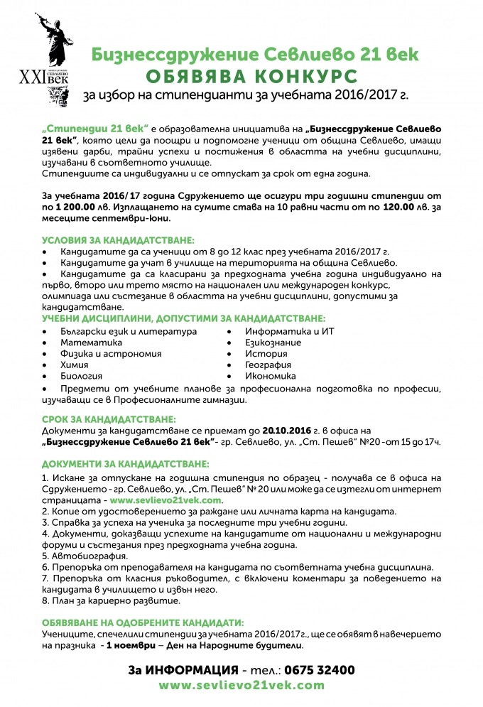 За трета година безнессдружение „Севлиево 21 век“ ще отпусне годишни стипендии на ученици, обявиха снощи от Управителния съвет на организацията. Стипендиите ще бъдат три, всяка от по 1200 лв., като парите ще се изплащат на 10 равни месечни вноски от по 120 лв. за времето от септември 2016 г. до юни 2017 г.