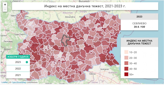 В обобщение - най-висока е стойността на индекса на данъчна тежест в Созопол (87,1), Столична община (72,3), Приморско (69,5), Поморие (69) и Варна (68,8), а най-ниска в Калояново (17,9), Медковец (19,7), Сатовча (20,3), Мирково (20,7) и Самуил (22,9). Сравнително висока данъчна тежест се наблюдава в големите областни центрове и черноморските общини, докато най-ниски са ставките предимно в малките слабонаселени общини. Севлиево е малко под златната среда, но във всеки случай гражданите никога не смятат, че данъците им са ниски, а управляващите винаги мислят точно обратното.