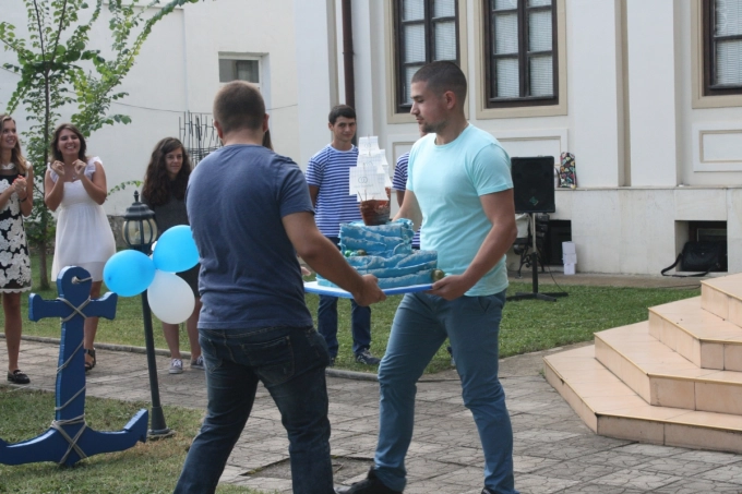 А закриването на стажантската програма традиционно бе по-скоро емоционално. За синьото лято /б.ред. един от цветовете в логото на компанията е син/, говореха макетите на корабчета, разположени в двора на галерия "Асен и Илия Пейкови", която бе домакин на събитието, малките корабчета-сувенири, които всеки от присъстващите отнесе, сладкиш с логото на компанията във форма на кораб, който всеки получи за "добре дошъл", а на финала голяма торта-кораб бе внесена от четирима стажанти, с уговорката, че "тортата се яде".