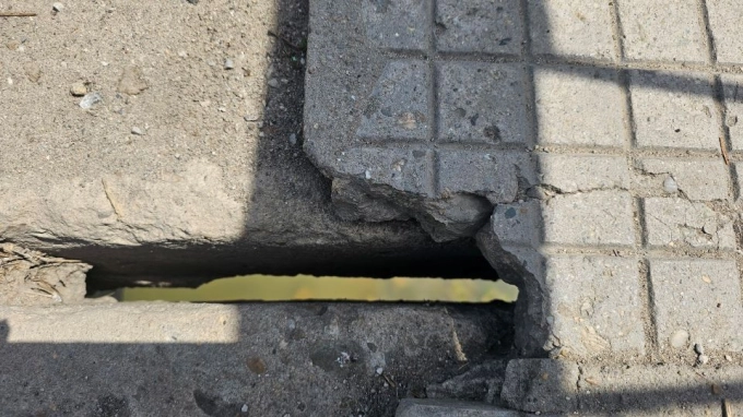 През тротоара и на места през пътното платно се вижда реката отдолу