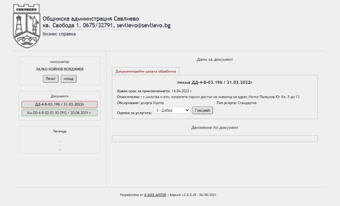 Скрийншот от деловодната система на Община Севлиево за онлайн проследяване