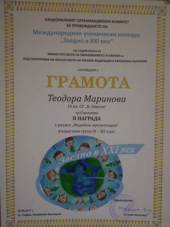 Десетокласничката от СУ "Васил Левски" в Севлиево Теодора Маринова се класира на второ място Международния ученически конкурс "Заедно в XXI век", който се провежда под патронажа на посолството на Русия у нас. Теодора участва в конкурса с презентация на тема "Низкий поклон освободителям Севлиево!", посветена на 140-годишнината от Освобождението на Севлиево.