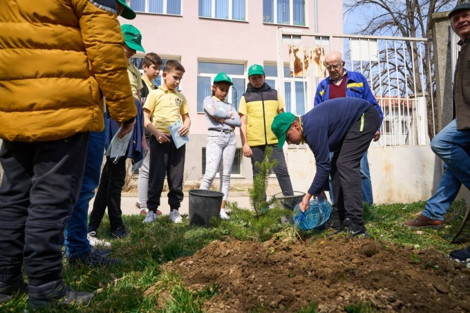Бял бор засадиха ученици заедно с директора на ДЛС "Росица". Дървото е подарък от стопанството, а децата обещаха да се грижат за него