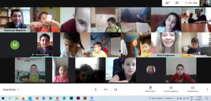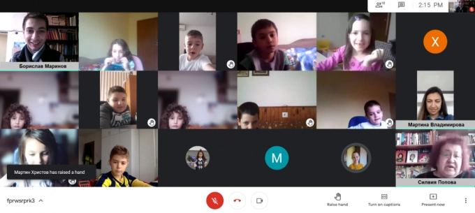 Първата ми онлайн среща бе с второкласниците, с които поговорихме за детските приказки, за българското народно творчество и заедно играхме занимателни игри. Учениците от 2г клас на г-жа Петя Стефанова не пропуснаха да ми покажат и книжките от домашните си библиотеки. В края на срещата децата бяха развълнувани, затова аз използвах момента да отправя едно маратонско книжно предизвикателство към тях. Предложих им да ми изпратят видеоклип, в който четат своя любима приказка, като отбелязах, че най-добрият сред четящите ще има възможността да получи хитовата книга на Джулия Доналдсън „Патилата на метлата“.