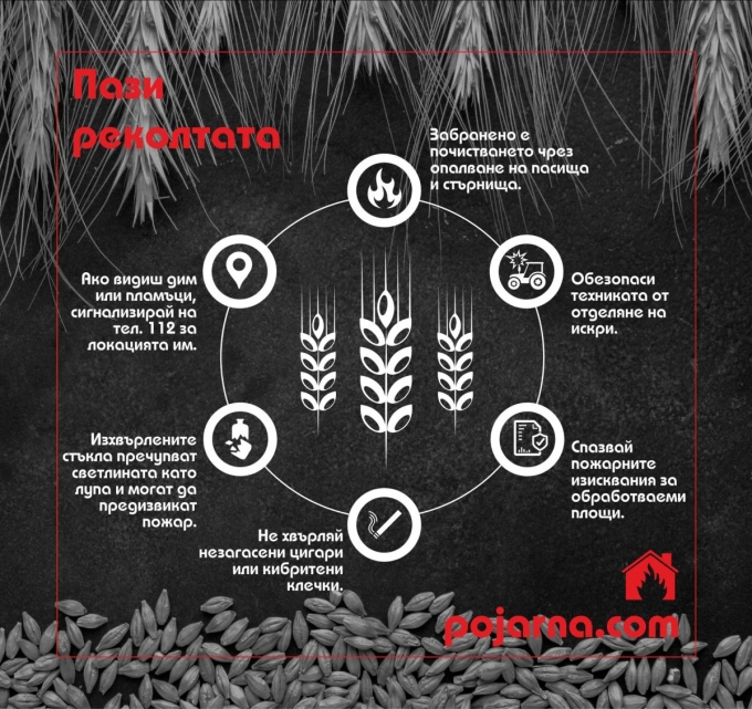 Главна дирекция „Пожарна безопасност и защита на населението“ призовава стопаните на земеделски земи, физическите и юридически лица, участващи в прибирането на селскостопанската реколта, към по-висока отговорност при изпълнение на своите дейности в, или в близост до житните масиви, за недопускане възникването и разпространението на пожари. В жътвената кампания да се използва земеделска техника, която е технически изправна и оборудвана с необходимите пожаротехнически средства за първоначално гасене на пожари.