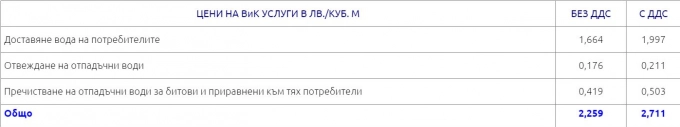 Това е цената за потребителите, които плащат освен за доставка и отвеждане на отпадните води, и за пречистване. За жителите на селата, които не заплащат за пречистване, цената се формира от сбора между доставка и отвеждане на отпадните води.