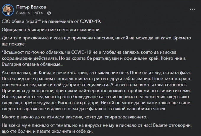 „СЗО обяви край на пандемията от COVID-19. Официално България сме световни шампиони“, пише експертът по управление на кризи Петър Велков във Фейсбук и публикува скрийншот с данни за надвишената смъртност в резултат на COVID-19. От данните се вижда, че България е на първо място.