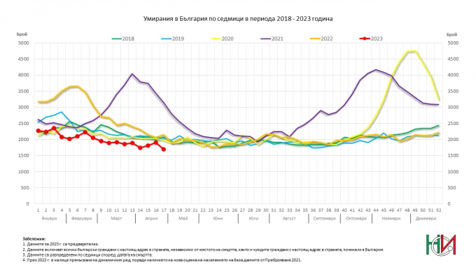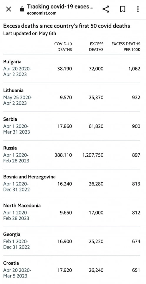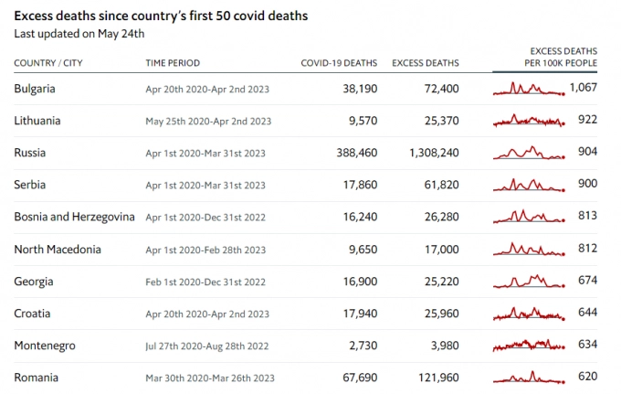 Според данните от The Economist до 23 май 2023 г. България все така е на първо място в света по надвишена смъртност на 100 хил. души с 38 190 официално обявени смъртни случаи заради Ковид-19, 72 400 извънредни умирания или 1 067 на 100 000 души. През ноември и декември 2020 г. е регистриран особено висок брой смъртни случаи в Югоизточна Европа, като България отбелязва най-високите седмични нива на надвишена смъртност от всяка друга страна в инструмента на The Economist.