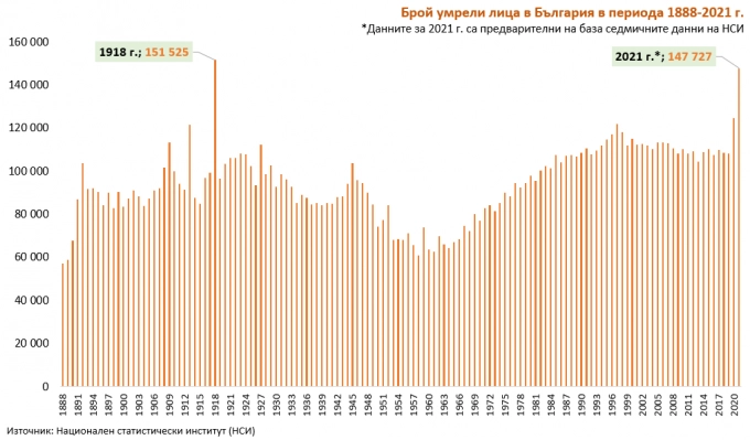 Въз основа на данните на НСИ Институтът за пазарна икономика прави извода, че 2021-а е годината с втората най-голяма смъртност като брой в историята на България. Повече смъртни случаи са отчетени само през 1918 г., когато са починали над 151 хил. души.