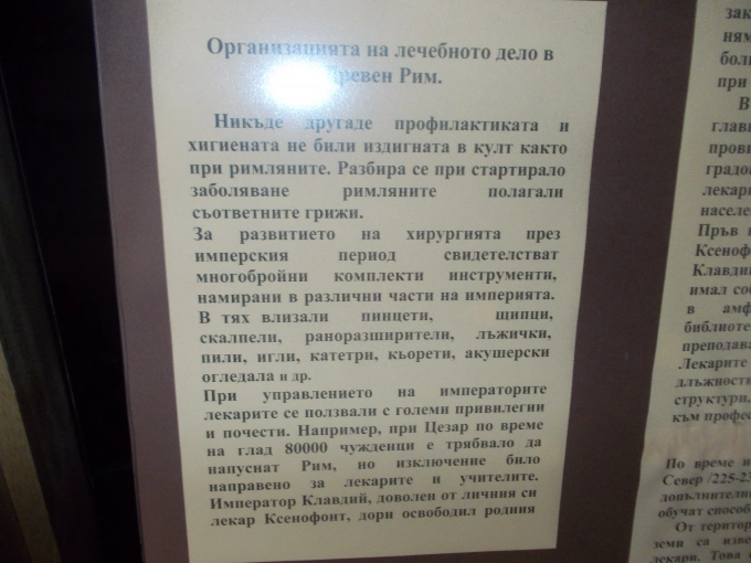 От изложбата ще научите, че една от най-великите личности в историята на античната медицина е бил лекарят Клавдий. Той от малък изучавал философия, медицина и природни науки, а за да стане лекар, постъпил в Коринт, после и в Александрия. Към 162 г. се преселил в Рим, където първоначално практикувал в гладиаторска школа, по-късно станал придворен лекар на Марк Аврелий, а после и на сина му Комод.