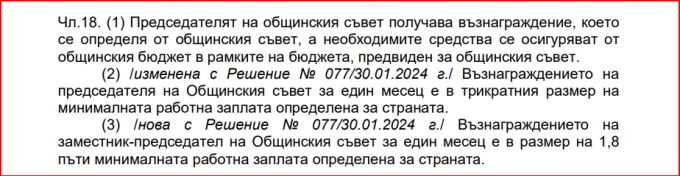 Какво се оказва в Севлиево? Двамата имат разписани заплати, но нямат работно време. За сравнение в Правилника за работа на Общинския съвет, по който се работеше в предишния мандат, изрично бе посочено, че заплатата на председателя при пълно работно време е 70% от тази на кмета. Този текст беше променен по-рано през седмицата и от него изпадна понятието работно време, за да остане само възнаграждение.