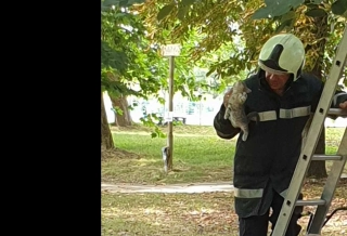 Пожарникари спасиха малко коте, като го свалиха от върха на дърво