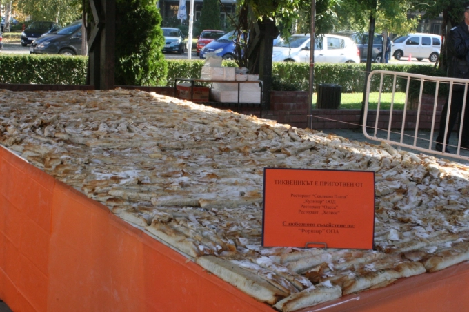 Тиквеник с дължина 288 м ще бъде изяден на днешния последен ден от Празниците на тиквата в Севлиево. Сладкишът е с 13 см по-дълъг от миналогодишния, който беше 275 м. Приготвен е от 63 кг кори за баница, 120 кг тиква, 21 кг захар, 16 кг орехи, 22 литра олио, половин килограм канела, 200 грама ванилия, а за украсата му са отишли 12 кг пудра захар.