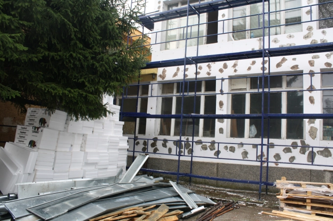 На някои места работата по изпълнение на проекта вече започна. Работи се по превръщане на фасадата на Първо основно училище в отговаряща на изискванията за енергийна ефективност, т.е. върху сложените преди години 5 см изолация, сега се добавят още толкова. А там, където не е топлоизолирано, ще се направи и това. Близо 3 000 квадрата изолация ще бъдат направени върху фасадата на Първо основно училище, като част от нея е за офиса на Младежкия център, който е настанен в същата сграда. Предвижда се частична подмяна на дограмата, като старата дървена се премахва изцяло. Новата, която ще се монтира е петпластова камерна с двоен стъклопакет. Ще се подменят с алуминиеви и вратите на училището. Изолация с каменна вата, скрита в гипсокартон, ще има на покрива, ще бъдат подменени някои от старите радиатори, а на останалите ще се монтира термостат. Планирана е подмяна и на осветлението в сградата.