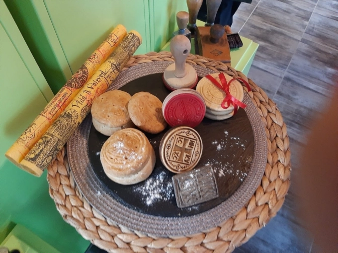 Всичко това на фона на семейни снимки, на съдебното решение за регистрирането на първата фирма. Там, на видно място е и дървената просфора (печат върху обредни хлябове) и направените в по-нови времена просфори. От една от тях Юлия дори е омесила малки питки, за да покаже значението на този знак.