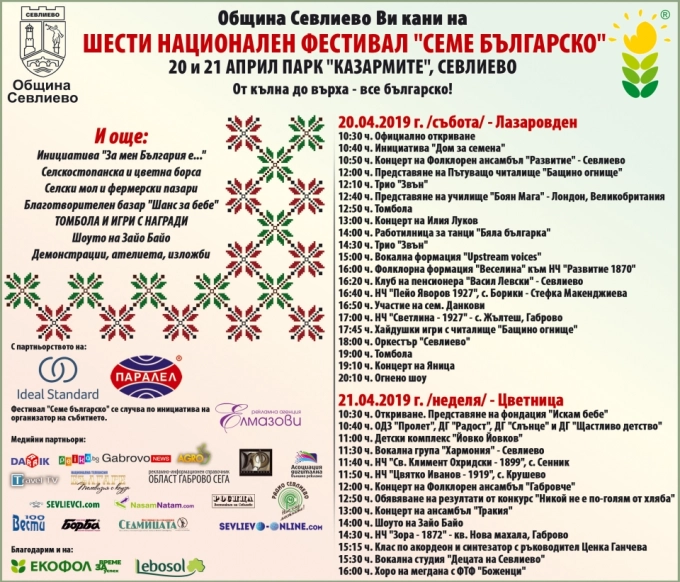 За доброто настроение на посетителите на шестото издание на фестивал "Семе българско" ще се погрижат и вокална група „Хармония“, народно читалище „Св.Климент Охридски – 1899“ от с. Сенник, народно читалище „Цвятко Иванов – 1919“ от с. Крушево, народно читалище „Зора“ - кв. Нова махала, Габрово и клас по акордеон и синтезатор с ръководител Ценка Ганчева.